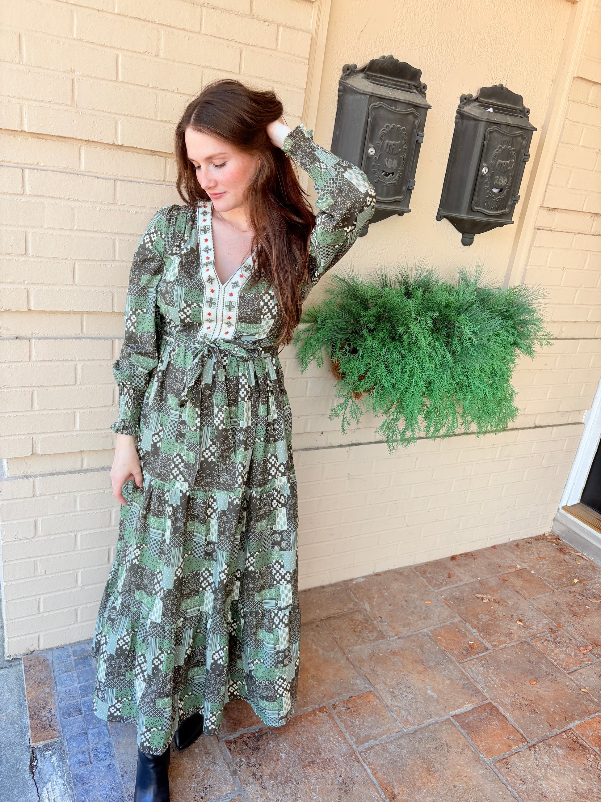 Cotton Patchwork Embroidered Maxi Dress - Olive Multi